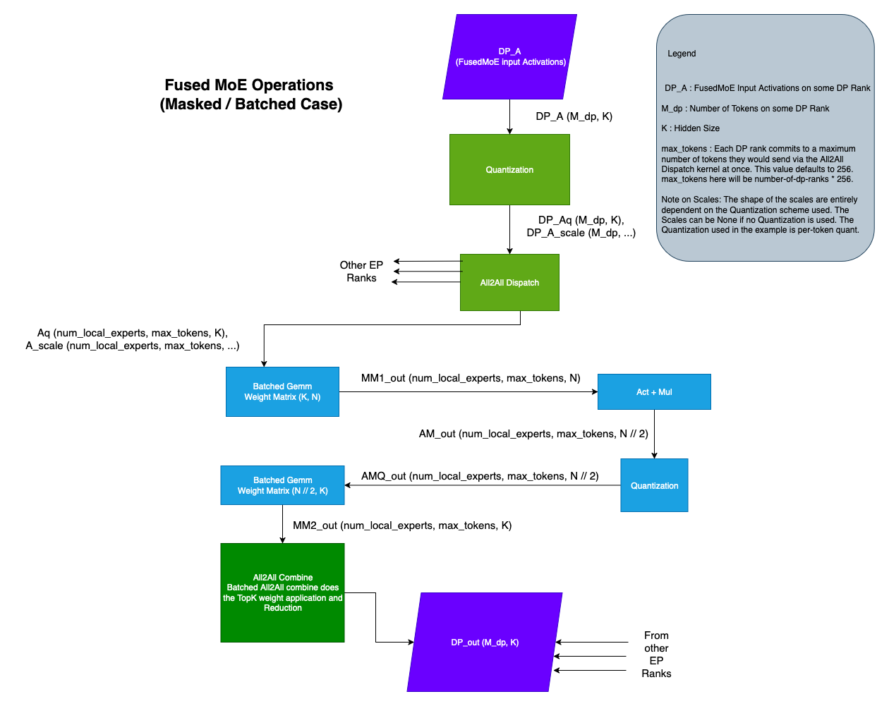 DeepEPHTPrepareAndFinalizefor an example. - In the Batched variant, the All2All Dispatch returns the activations as a tensor of shape (num_experts, max_tokens, K). Here, the activations/tokens that subscribe to the same expert are batched together. Note that not all entries of the tensor are valid. The activations tensor is typically accompanied by an